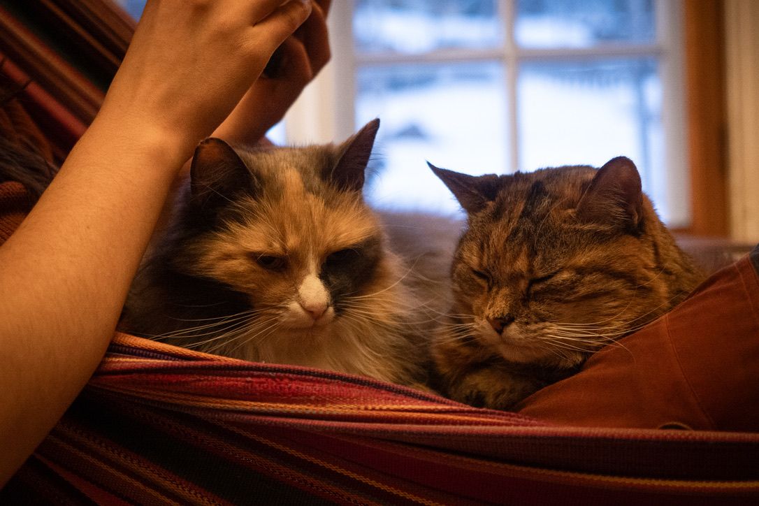 Katzen — Unsere beiden älteren Katzendamen Mina & Medina leben mit uns im Haupthaus, lieben es, sich auf einem bequemen Schoss einzurichten und haben schon viele Besucher*innen kennengelernt.